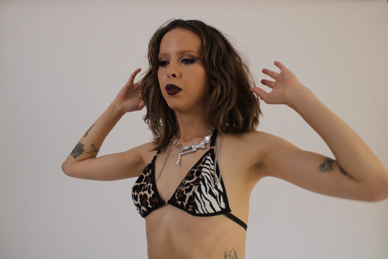 Top de silueta triangular estilo bikini, confeccionado en combinación de dos telas con estampados animal print. Cada triángulo presenta un diseño dividido que integra mitad print de cebra y mitad print de leopardo, generando un contraste visual marcado.